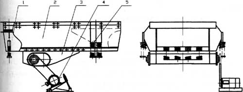 ZSW系列振動(dòng)喂料機(jī)是利用兩個(gè)呈特定位置的偏心軸以齒輪相嚙合而組成激振器,裝配時(shí)必須使兩齒輪按標(biāo)記相嚙合,然后通過電機(jī)驅(qū)動(dòng),使兩偏心軸旋轉(zhuǎn),從而產(chǎn)生巨大合成的直線激振力,使機(jī)體在支承彈簧上作強(qiáng)制振動(dòng),物料則以此振動(dòng)為動(dòng)力,在料槽上作滑動(dòng)及拋擲運(yùn)動(dòng),從而使物料前移而達(dá)到給料目的。當(dāng)物料通過槽體上的篩條時(shí),較小的料可通過篩條間隙而落下,可不經(jīng)過下道的破碎工序,起了篩分的效果。產(chǎn)品結(jié)構(gòu)及技術(shù)參數(shù)