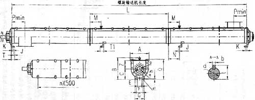 注:1、螺旋機(jī)輸送長度及尺寸L均見表二、表三。 2、圖n×500為蓋板卡子尺寸,n值視螺旋機(jī)長度而定。 3、圖中尺寸p為進(jìn)出料口中心線。