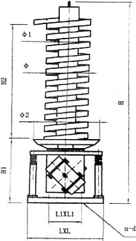 ZC系列垂直振動輸送機的驅(qū)動裝置振動電機安裝在輸送塔下部,兩臺振動電機對稱交叉安裝,輸送塔由管體和焊接在管體周圍的螺旋輸送槽組成,輸送塔座于減振裝置上,減振裝置由底座和隔振彈簧組成。(見圖一)當垂直輸送機工作時,根據(jù)雙振動電機自同步原理,由振動電機產(chǎn)生激振力,強迫整個輸送塔體作水平圓運動和向上垂直運動的空間復合振動,螺旋槽內(nèi)的物料則受輸送槽的作用,作勻速拋擲圓運動,沿輸送槽體向上運動,從而完成物料的向上(或向下)輸送作業(yè)。